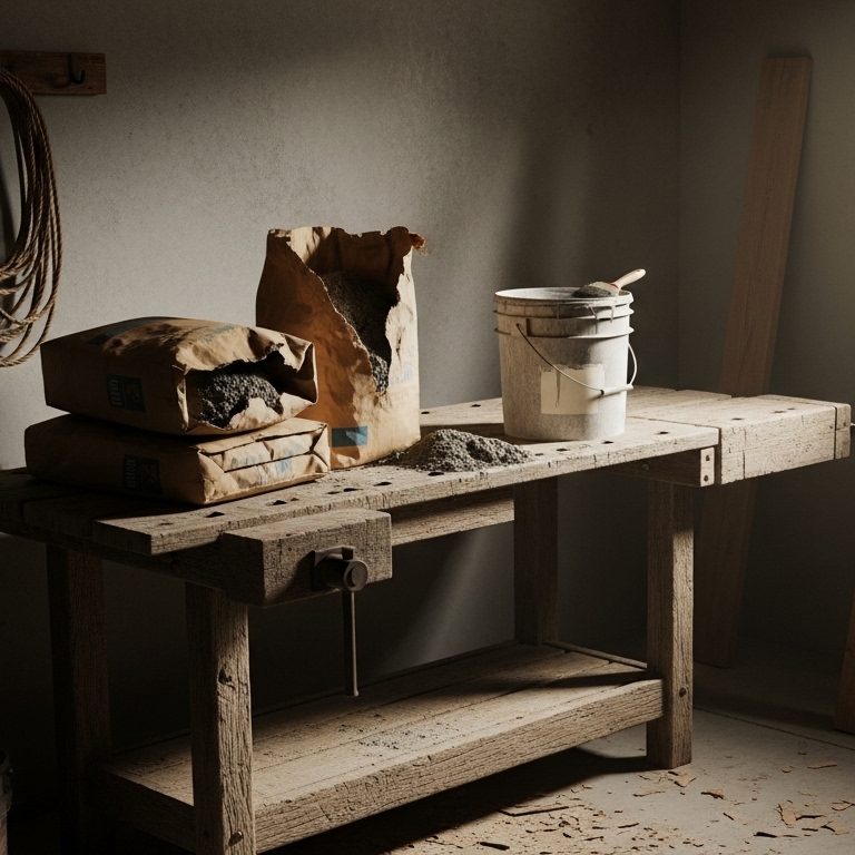 Baustoffe: Säcke mit Zement, Putz oder Fliesenkleber (trocken gelagert).